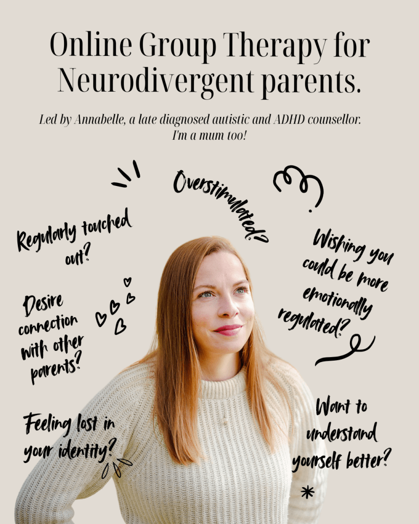 They will take place during the day on a Tuesday or Friday, at a cost of around £20 a session, lasting for 60 – 90 minutes. Exact details to be decided. A different focused topic with supportive chat each week, led by me, Annabelle, a late diagnosed autistic and ADHD mum and counsellor.